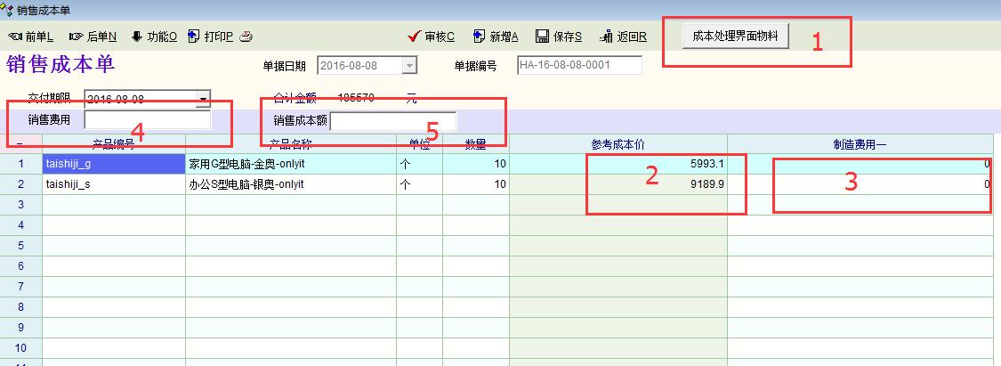 第三步 引用销售订单,创建“销售成本单”。 销售成本单有五个方面,如图 1 表头创建“成本处理单据界面上物资”按钮(1) ,这样就可以把成品实时的“参考成本价”(2)填写到下面单据中。--这个费用就是材料费用。 2 “制造费用” 栏,这个是由下级单据“计件工资”反写的。 3销售费用--可以包括物流费用、销售增品、销售提成、销售所产生的其他费用组成。手工填写。 4 销售成本 =本单合计金额(参考成本价格*数量+制造费用)+销售费用 |