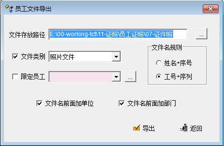 2、导出:部门  和 单位信息,在文件名之后,且 文件名规则为“姓名.工号.部门.单位.jpg”或“工号.姓名.部门.单位.jpg”