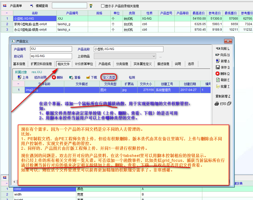 在 产品资料,相关文件。 这里非常好,可以上传不同类型的文档。 现在有个需求,因为一个产品的不同文档是分不同的人去管理的。 比如: 1、PE制程文档,由PE工程师负责上传,但没有权限删除,版本迭代由其在备注里填写,上传与删除由不同用户控制件,实现文件更严格的管控。 2、同样的,产品图片由打版工程师上传,并同1一样进行权限控件。 现在遇到的问题是,双击打开对应的产品资料,在这个tabsheet里可以用脚本控制相应的按钮显示。 但已经上传的所有相关文件则一览无遗。可否添加一个函数事件,比如类似grid_focus,捕获当前鼠标所在行 通过检测当前行对应的值来决定相关按钮如上传、删除、查看、下载,及双击是否开启文件查看。 如果可以,则在这个文件管理里可以获得更加精细的权限细分需求了。非常感谢。 |