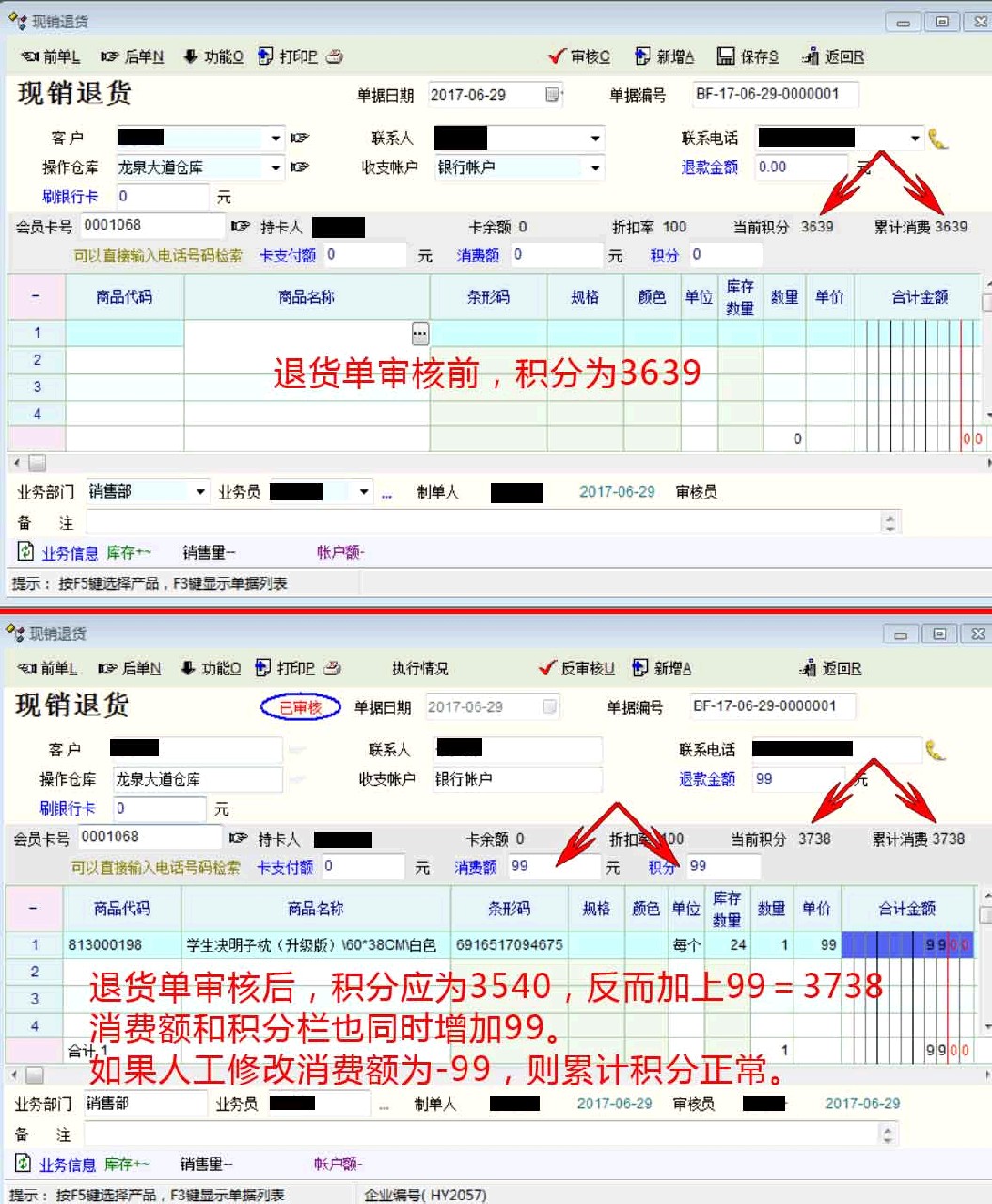 发生退货业务时,退货额不但不减相应积分,反而把退货额做为消费额累加进积分。