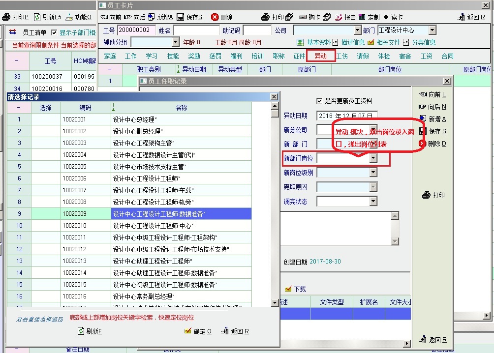 2、调岗调职 录入“原部门岗位”和“新部门岗位”