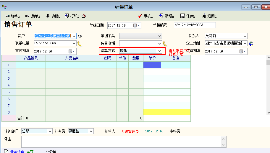 但是,我们现在的情况是,一个客户一个结算方式是固定的,比如现金或者转账;而且结算条件,日结、月结、20天结,也是固定的。所以,最好在客户资料新建的时候,就做一个选择,然后订单创建的时候,直接带入到销售订单的界面,不用在选择了,这样更方便。