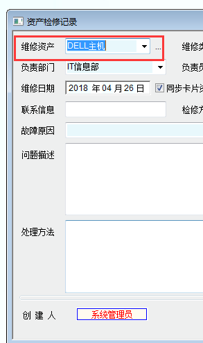 另外在“资产检修记录”里的“维修资产”能否与“资产编号”或“资产名称”显示呢