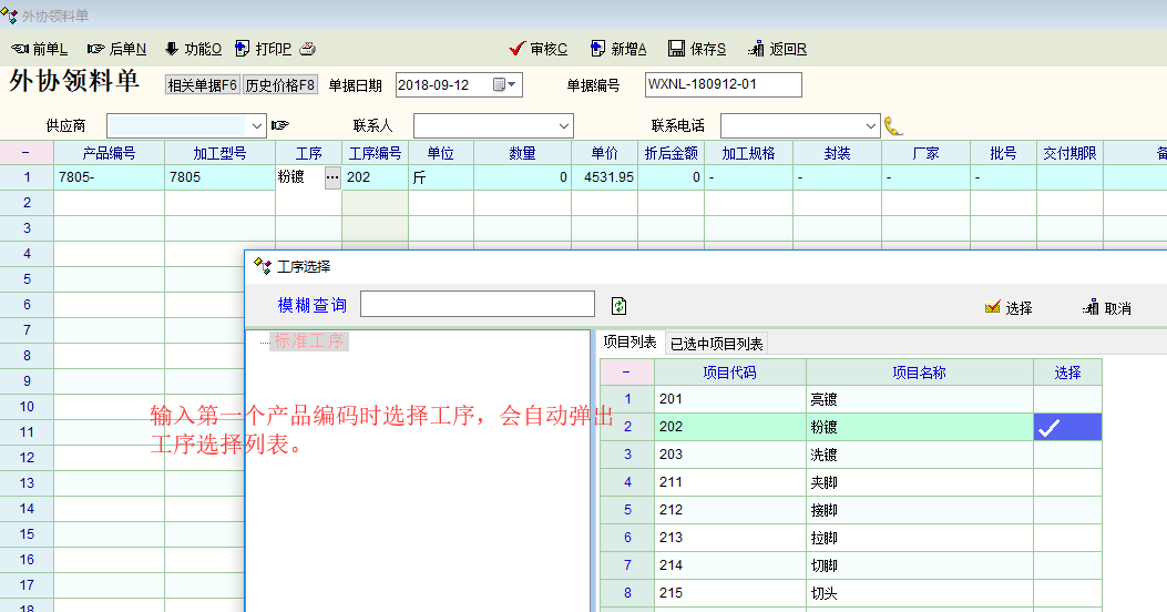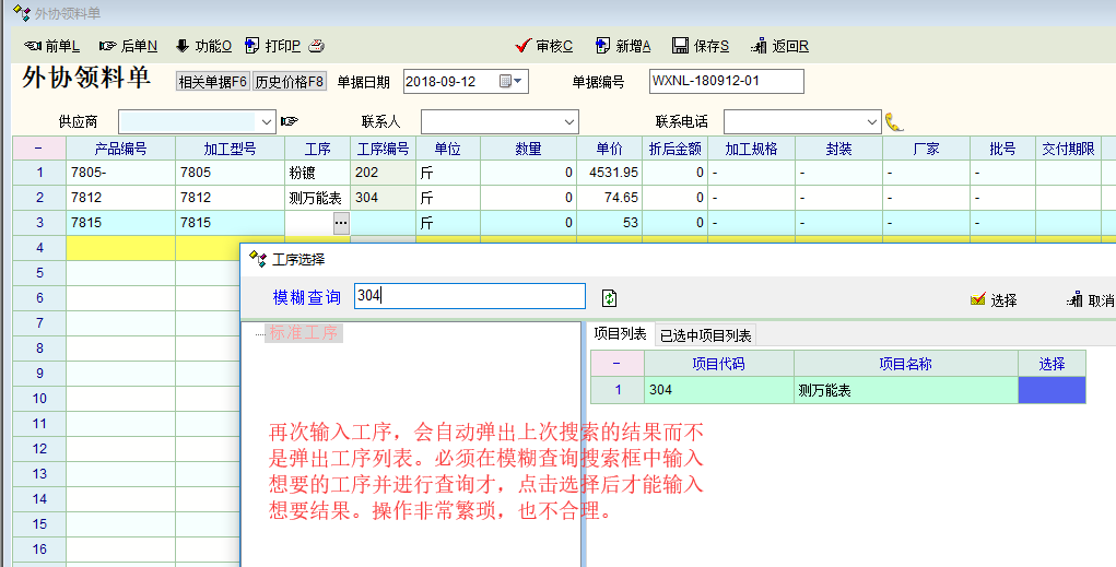 在生产单据(以外协领料单为例)中输入工序时,系统会自动弹出工序选择列表而不是直接输入所要输入的工序,效率太低。建议当输入的工序是正确(与工序列表中项目代码或项目名称完全一致)时直接在单元格中输入而不是弹出工序列表进行选择,就像输入产品编码一样。