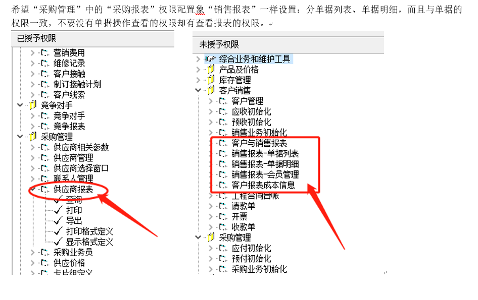 希望“采购管理”中的“采购报表”权限配置象“销售报表”一样设置:分单据列表、单据明细,而且与单据的权限一致,不要没有单据操作查看的权限却有查看报表的权限