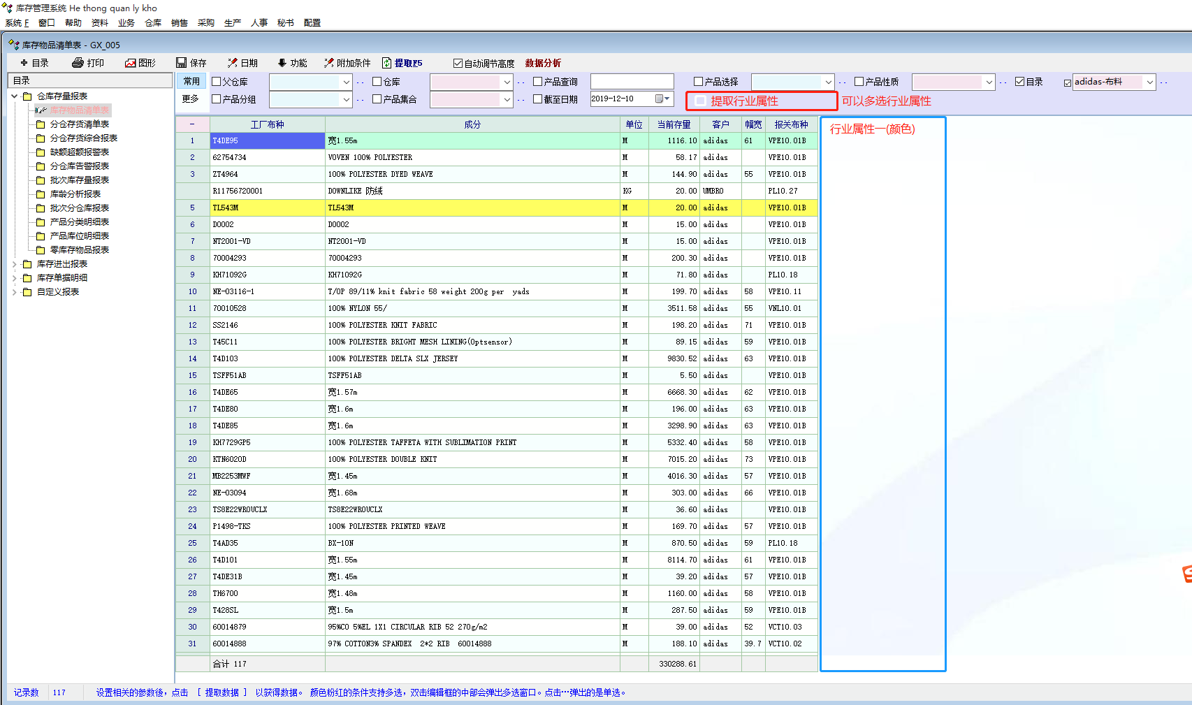 老师,因服装行业有启用行业属性,例如颜色就是行业属性一, 那么在提取库存清单和库存进出汇总报表的时候,老板希望能按看到各颜色的库存数量和进出数量,所以希望老师能增加库存清单和库存进出汇总报表希望能增加提取行业属性的控件(多选), 或者直接在显示方案里面增加行业属性的启用,谢谢!