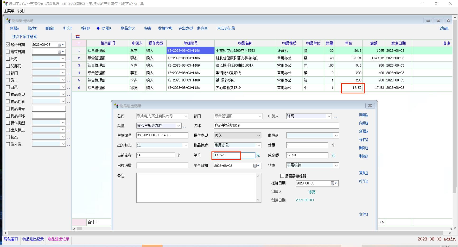 物品进出记录录入框输入三位小数点的单价金额,点击保存后,在记录栏中的单价也需要进行四舍五入。希望可以继续改进一下。谢谢老师!
