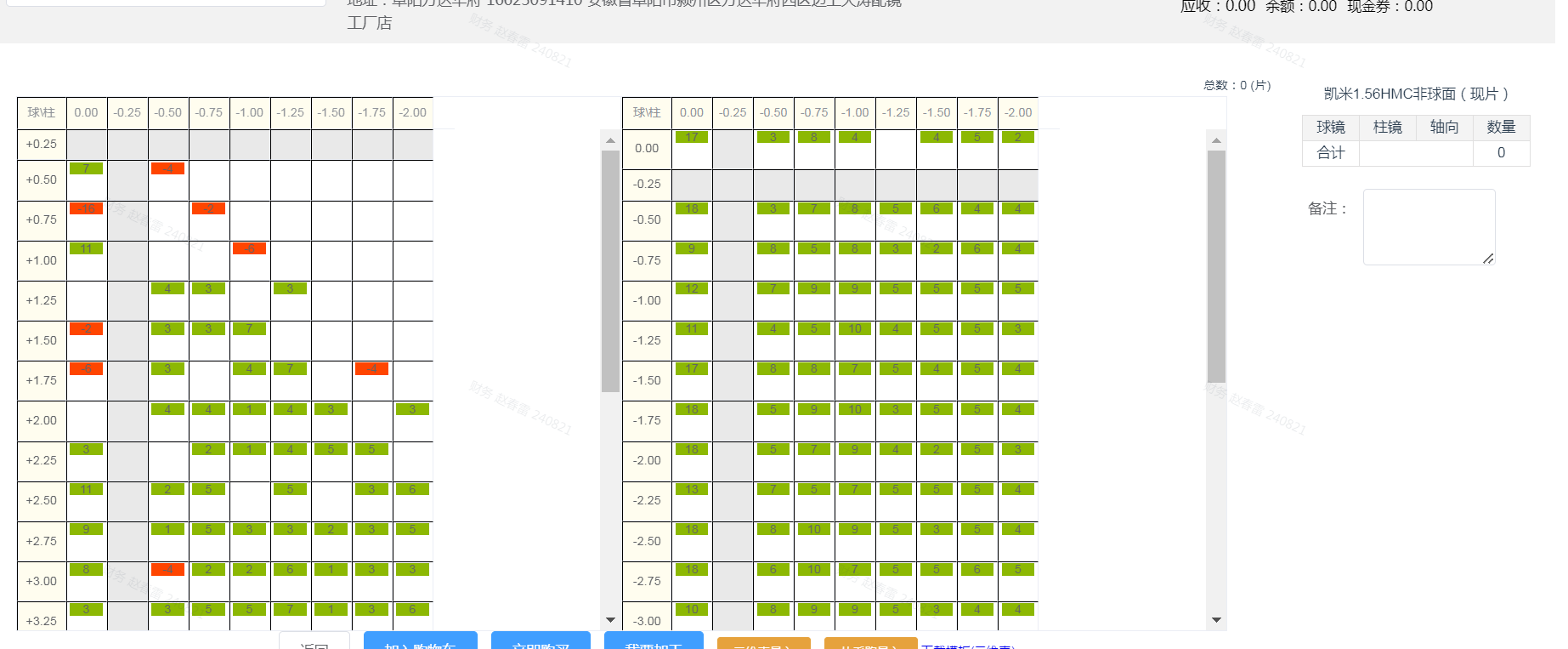 3.给这副镜架配上合乎消费者度数镜片 这时候就要查库存了。比如 0.00+0.50 ,这个一定是固定的,查