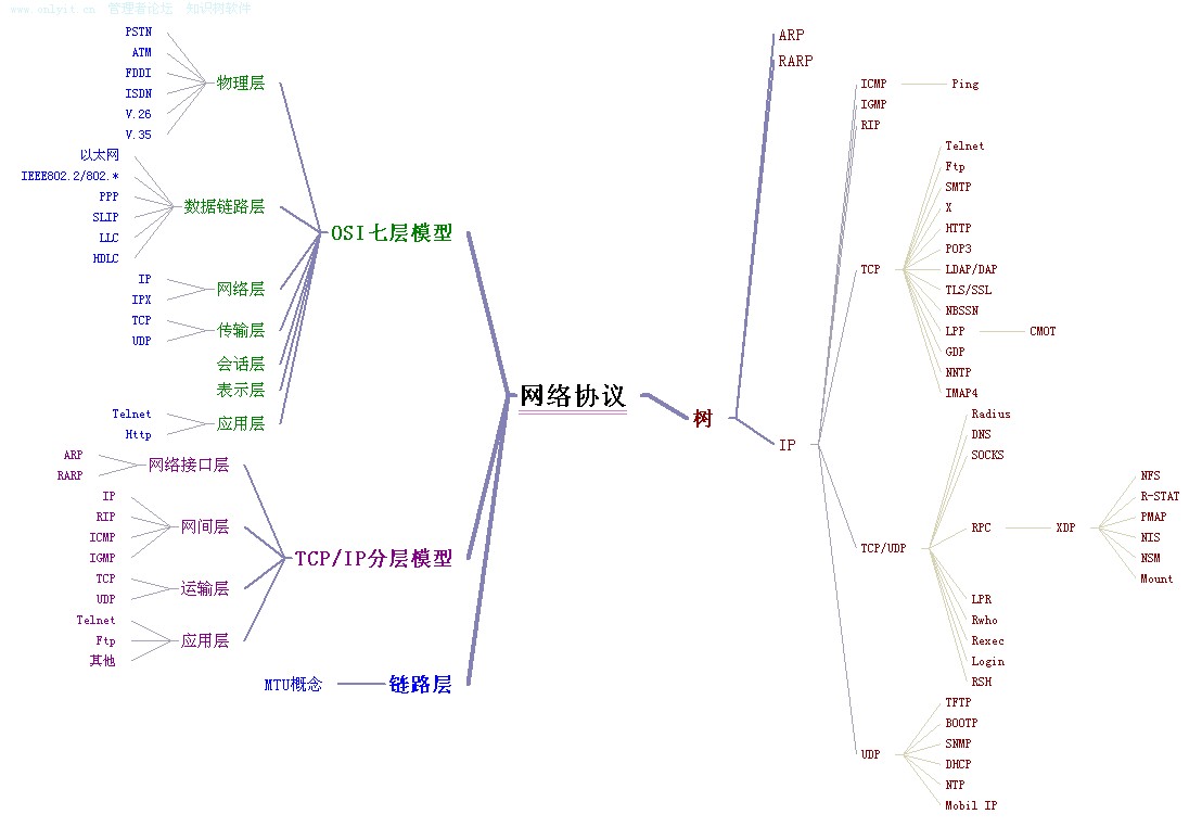 该知识树记录了OSI 7层网络协议模型和TCP/IP分层模型,说明了各层次的相关功能,列举了各层对应的协议。按照层次结构构建了TCP/IP协议族的一棵树,上面标注了常见的相关协议。