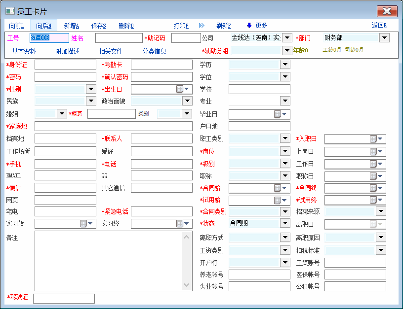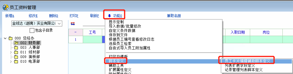 有用户在论坛发帖希望员工卡片的必填项目控件名能设置为红色以便能突出显示出来让人事资料建档人员录入资料时一目了然,在官方没有更新这个功能之前,可以先参考我的这个脚本(我增加了控件名前面加*)以达到使用需求 必填项目有增减的,需要重新登录才能刷新 打开员工卡片编辑辅助脚本定义(rec.emp) extern change_obj; int func_f9_call() { //msg('f9 pressed'); return 1; }; int func_show_win() { int i,count; string sql,Mzd,v; db_run("select col_id from app_not_null_def where tab_id='emp'")//获取员工卡片必填项目定义明细 count = db_row_count();//已定义的控件数 gui_set_font_color('Label27',16711935);//工号 gui_set_font_color('Label28',16711935);//姓名 for (i = 0; i < count;i++) { db_go_row(i); Mzd = db_res(0) if(Mzd == 'dept_id'){ gui_set_font_color('Label_Dept',0x0000ff); gui_set_text("Label_Dept",'*'+gui_get_text("Label_Dept"))//1.部门 }if(Mzd == 'cross_group_id'){ gui_set_font_color('Label1',0x0000ff); gui_set_text("Label1",'*'+gui_get_text("Label1"))//2.辅助分组 }if(Mzd == 'nation'){ gui_set_font_color('Label_Nation',0x0000ff); gui_set_text("Label_Nation",'*'+gui_get_text("Label_Nation"))//3.民族 }if(Mzd == 'polity'){ gui_set_font_color('Label_Polity',0x0000ff); gui_set_text("Label_Polity",'*'+gui_get_text("Label_Polity"))//4.政治面貌 }if(Mzd == 'marriage_flag'){ gui_set_font_color('Label_Marriage_Flag',0x0000ff); gui_set_text("Label_Marriage_Flag",'*'+gui_get_text("Label_Marriage_Flag"))//5.婚姻 }if(Mzd == 'college'){ gui_set_font_color('Label_College',0x0000ff); gui_set_text("Label_College",'*'+gui_get_text("Label_College"))//6.学校 }if(Mzd == 'specialty'){ gui_set_font_color('Label_Specialty',0x0000ff); gui_set_text("Label_Specialty",'*'+gui_get_text("Label_Specialty"))//7.专业 }if(Mzd == 'native_place'){ gui_set_font_color('Label_Native_Place',0x0000ff); gui_set_text("Label_Native_Place",'*'+gui_get_text("Label_Native_Place"))//8.籍贯 }if(Mzd == 'home_address'){ gui_set_font_color('Label_Home_Address',0x0000ff); gui_set_text("Label_Home_Address",'*'+gui_get_text("Label_Home_Address"))//9.家庭地 }if(Mzd == 'culture_degree'){ gui_set_font_color('Label_Culture_Degree',0x0000ff); gui_set_text("Label_Culture_Degree",'*'+gui_get_text("Label_Culture_Degree"))//10.学历 }if(Mzd == 'related_man'){ gui_set_font_color('Label_Related_Man',0x0000ff); gui_set_text("Label_Related_Man",'*'+gui_get_text("Label_Related_Man"))//11.联系人 }if(Mzd == 'graduate_date'){ gui_set_font_color('Label_Graduate_Date',0x0000ff); gui_set_text("Label_Graduate_Date",'*'+gui_get_text("Label_Graduate_Date"))//12.毕业日 }if(Mzd == 'sex'){ gui_set_font_color('Label_Sex',0x0000ff); gui_set_text("Label_Sex",'*'+gui_get_text("Label_Sex"))//13.性别 }if(Mzd == 'birthday'){ gui_set_font_color('Label_Birthday',0x0000ff); gui_set_text("Label_Birthday",'*'+gui_get_text("Label_Birthday"))//14.出生日 }if(Mzd == 'register_location'){ gui_set_font_color('Label_Register_Location',0x0000ff); gui_set_text("Label_Register_Location",'*'+gui_get_text("Label_Register_Location"))//15.户口地 }if(Mzd == 'file_location'){ gui_set_font_color('Label_File_Location',0x0000ff); gui_set_text("Label_File_Location",'*'+gui_get_text("Label_File_Location"))//16.档案地 }if(Mzd == 'work_location'){ gui_set_font_color('Label_Work_Location',0x0000ff); gui_set_text("Label_Work_Location",'*'+gui_get_text("Label_Work_Location"))//17.工作场所 }if(Mzd == 'avocation'){ gui_set_font_color('Label_Avocation',0x0000ff); gui_set_text("Label_Avocation",'*'+gui_get_text("Label_Avocation"))//18.爱好 }if(Mzd == 'residence_type'){ gui_set_font_color('Label_Residence_Type',0x0000ff); gui_set_text("Label_Residence_Type",'*'+gui_get_text("Label_Residence_Type"))//19.类别 }if(Mzd == 'note_info'){ gui_set_font_color('Label_Note_Info',0x0000ff); gui_set_text("Label_Note_Info",'*'+gui_get_text("Label_Note_Info"))//20.备注 }if(Mzd == 'telephone'){ gui_set_font_color('Label_Telephone',0x0000ff); gui_set_text("Label_Telephone",'*'+gui_get_text("Label_Telephone"))//21.电话 }if(Mzd == 'mobile'){ gui_set_font_color('Label_Mobile',0x0000ff); gui_set_text("Label_Mobile",'*'+gui_get_text("Label_Mobile"))//22.手机 }if(Mzd == 'email'){ gui_set_font_color('Label_Email',0x0000ff); gui_set_text("Label_Email",'*'+gui_get_text("Label_Email"))//23.EMAIL }if(Mzd == 'qq_no'){ gui_set_font_color('Label_Qq',0x0000ff); gui_set_text("Label_Qq",'*'+gui_get_text("Label_Qq"))//24.QQ }if(Mzd == 'msn_no'){ gui_set_font_color('Label_Msn',0x0000ff); gui_set_text("Label_Msn",'*'+gui_get_text("Label_Msn"))//25.微信 }if(Mzd == 'other_im_no'){ gui_set_font_color('Label_Other_Im_No',0x0000ff); gui_set_text("Label_Other_Im_No",'*'+gui_get_text("Label_Other_Im_No"))//26.其它通信 }if(Mzd == 'person_web'){ gui_set_font_color('Label_PersonWeb',0x0000ff); gui_set_text("Label_PersonWeb",'*'+gui_get_text("Label_PersonWeb"))//27.网页 }if(Mzd == 'home_phone'){ gui_set_font_color('Label_Home_Phone',0x0000ff); gui_set_text("Label_Home_Phone",'*'+gui_get_text("Label_Home_Phone"))//28.宅电 }if(Mzd == 'urgent_telephone'){ gui_set_font_color('Label_Urgent_Telephone',0x0000ff); gui_set_text("Label_Urgent_Telephone",'*'+gui_get_text("Label_Urgent_Telephone"))//29.紧急电话 }if(Mzd == 'paper_id'){ gui_set_font_color('Label_Paper_Id',0x0000ff); gui_set_text("Label_Paper_Id",'*'+gui_get_text("Label_Paper_Id"))//30.身份证 }if(Mzd == 'emp_card_no'){ gui_set_font_color('Label_Emp_Card_No',0x0000ff); gui_set_text("Label_Emp_Card_No",'*'+gui_get_text("Label_Emp_Card_No"))//31.考勤卡 }if(Mzd == 'dept_post'){ gui_set_font_color('Label_Dept_Post',0x0000ff); gui_set_text("Label_Dept_Post",'*'+gui_get_text("Label_Dept_Post"))//32.岗位 }if(Mzd == 'post_date'){ gui_set_font_color('Label_Post_Date',0x0000ff); gui_set_text("Label_Post_Date",'*'+gui_get_text("Label_Post_Date"))//33.上岗日 }if(Mzd == 'contract_type'){ gui_set_font_color('Label_Contrac