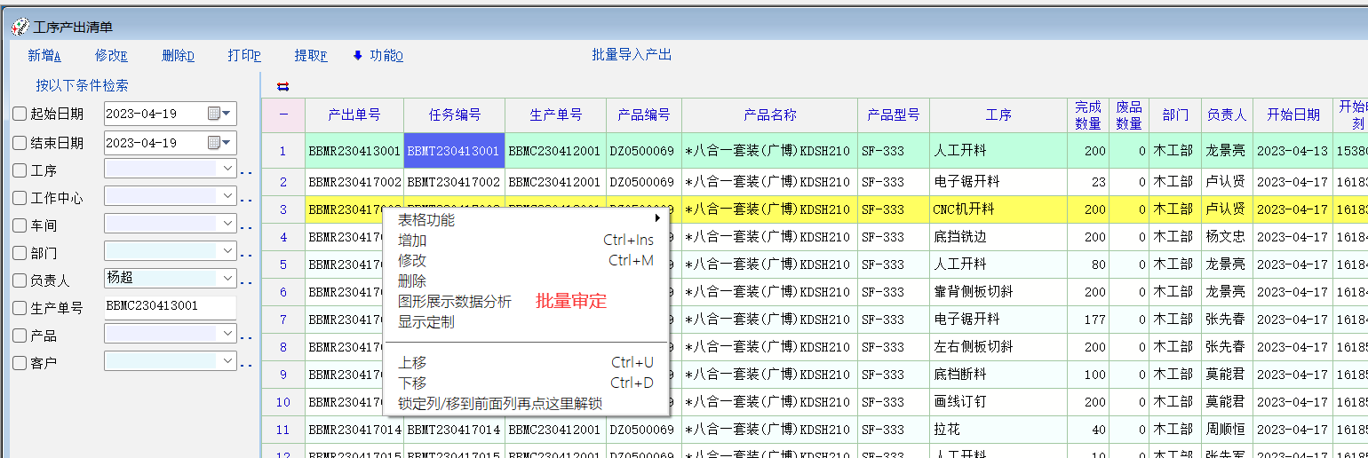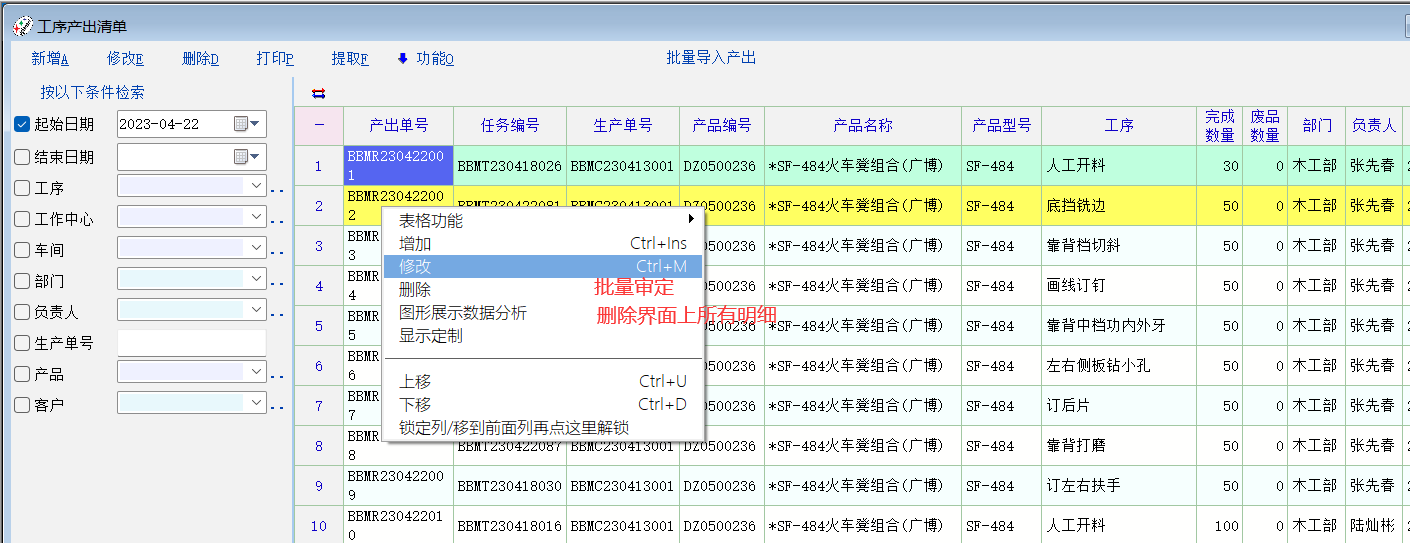 老师,可否在生产管理  工序任务、工序产出增加批量审定功能? 工序产出清单如任务清单一样增加删除界面上所有的记录(用于对导入错误的明细批量快速的删除)