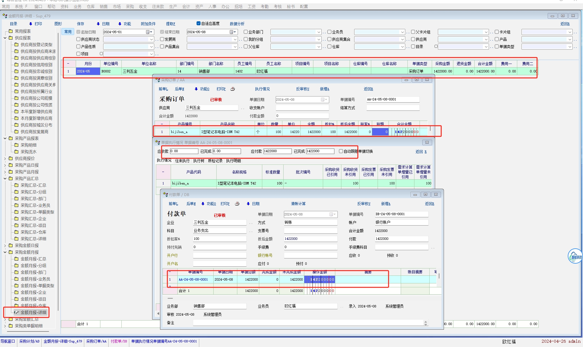采购金额是需要你有金额来往才有记录的,不是说你建立采购单就可以了的,它跟采购汇总是两回事,实在不行拿演示库操作几次,再不行就照抄演示库的设置