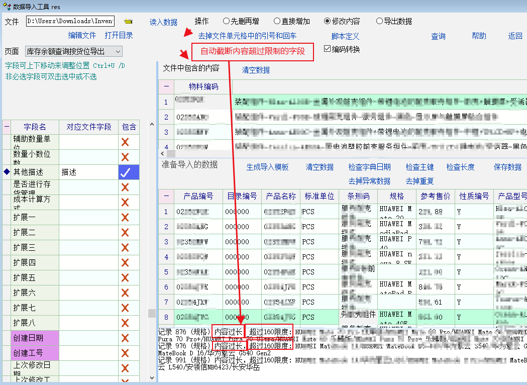数据信息导入 时,已经有了自动去除引号和回车的功能,目前字段内容超过限制还需要手动去处理.是否能增加一个自动截断超过字符限制字段的功能,让信息导入更方便,谢谢 |
