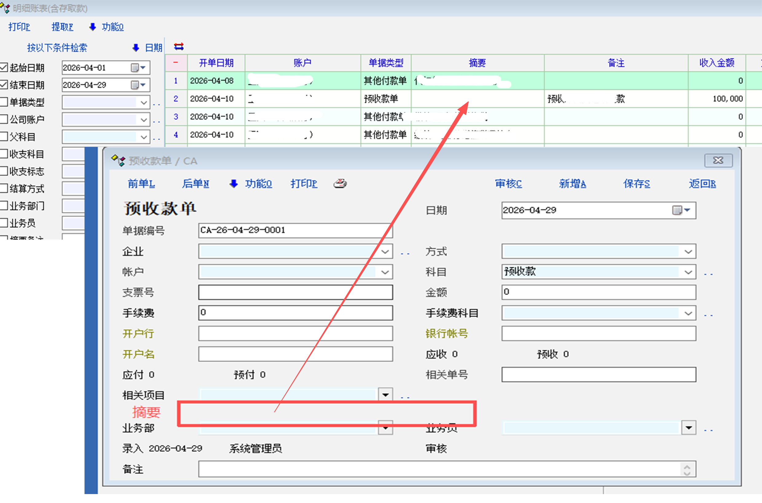 在预收(预付)款单最下面增加摘要信息编辑栏框,那么在查询明细账表查询显示窗口中就可以显示摘要信息了。