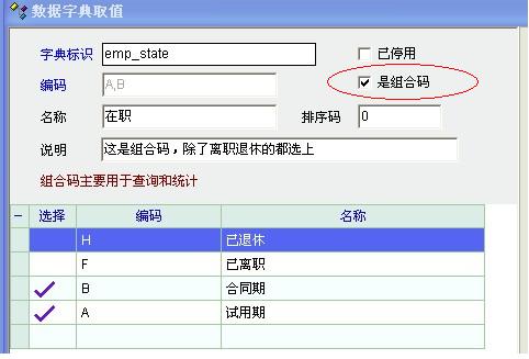 组合码就是几个字典合在一起,比如员工资料里的职工状态,在职 = 试用期+合同期,便于查询统计,但员工卡片中不能设置这个组合码,特别是初始化导入的时候不要使用组合码。