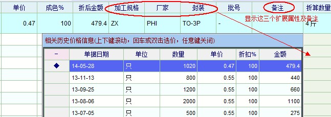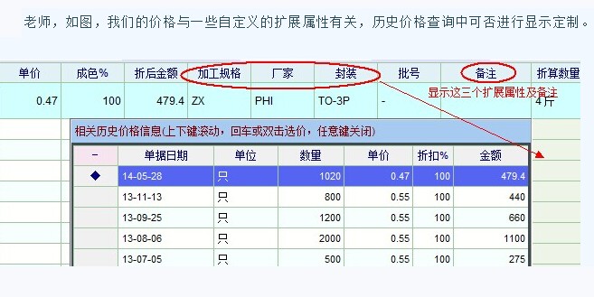 老师,如图,我们的价格与一些自定义的扩展属性有关,历史价格查询中可否进行显示定制。