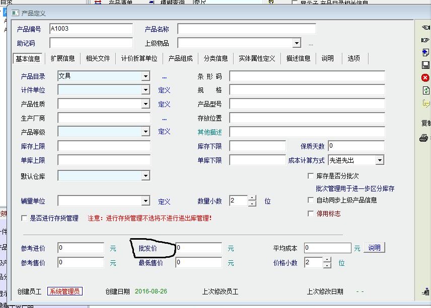 第一步:在产品编号页面里面把最“高进价”标签改成想要的内容“批发价”,然后在添加产品后,在“产品资料管理”里面的“功能”显示定制里面有个最高进价也改成“批发价”。