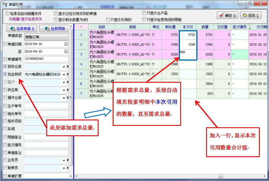 2、在引用单据时,能够输入物资总数量,自动从销售订单,自上而下的顺序填充引用数量,不用人工计算来拼凑至总数量。