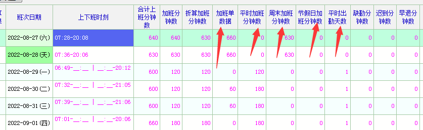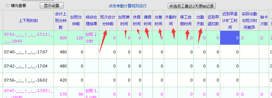 希望在界面上添加当天班次“合计分钟数”“请假记录”“出差记录”“请假记录”“调休记录”“加班记录”“外勤记录”“缺勤记录”这些项目的数据体现,便于有参与这些项目计算的用户设置简单的公式用于计算。还有考勤月帐里面的出勤天数的计算---因为是按打卡就算出勤一天,这种统计方式是不对的。因该按实际出勤时间(除去加班时间)除以当天排班的“班次合计”时间来计算出勤天数,所以最好在考勤日帐里面也需要显示天数的计算((合计分钟数-加班分钟数)/班次合计分钟数)。不然,目前8个扩展项目根本不够使用!希望重点考虑