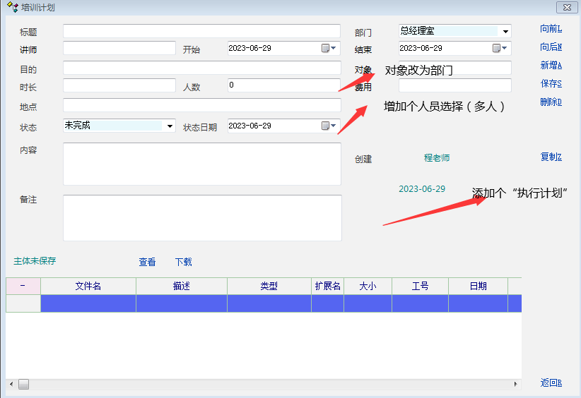 鉴于目前培训需求,培训记录,签到记录等都不相互关联,根据一般客户的实际使用需求,特地经过长时间了解客户的需求,建议目前的培训需求界面上:对象可以改为“部门”,再增加个“人员”选择(多人),界面上再添加个“执行计划”,点击执行计划-----直接产生签到界面(目前秘书功能里面的签到)-----生成签到二维码-----扫描签到-----生成“签到表”(目前没有)------签到表上点击“生成培训记录”所有人员自动生成培训记录