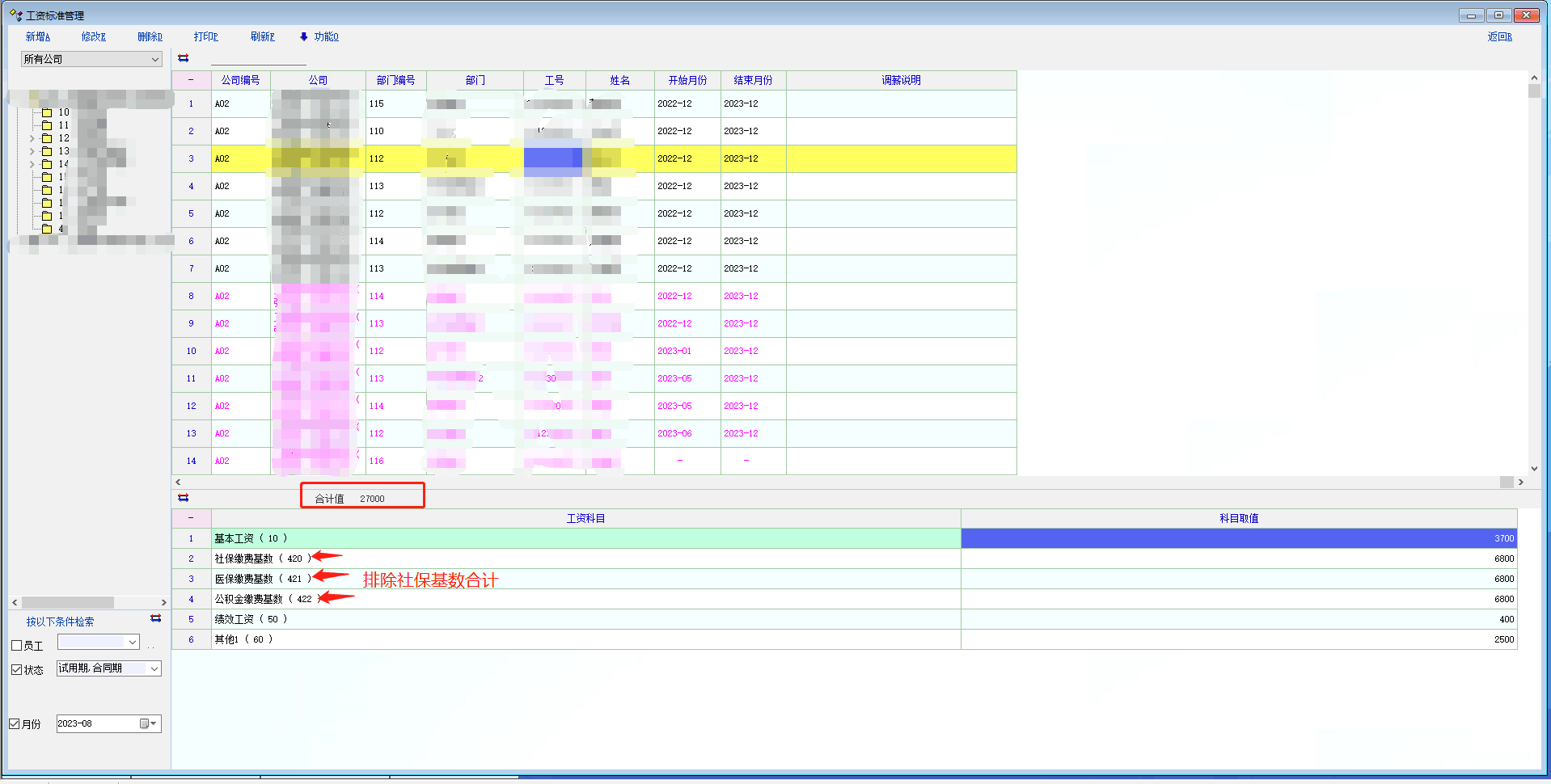 目前公司工资标准有基本工资和全勤以及社保基数等科目组成,为了方便做数据人员可以直观的看到每个人的基本工资金额,要求孟老师加了工资标准科目合计功能,实际使用中发现公司的社保基数并不能参与到基本工资合计数额当中去,所以想看看老师能不能有办法做到可以自定义选择要合计的科目,或者有没有其他办法可以解决的,感谢!!!!