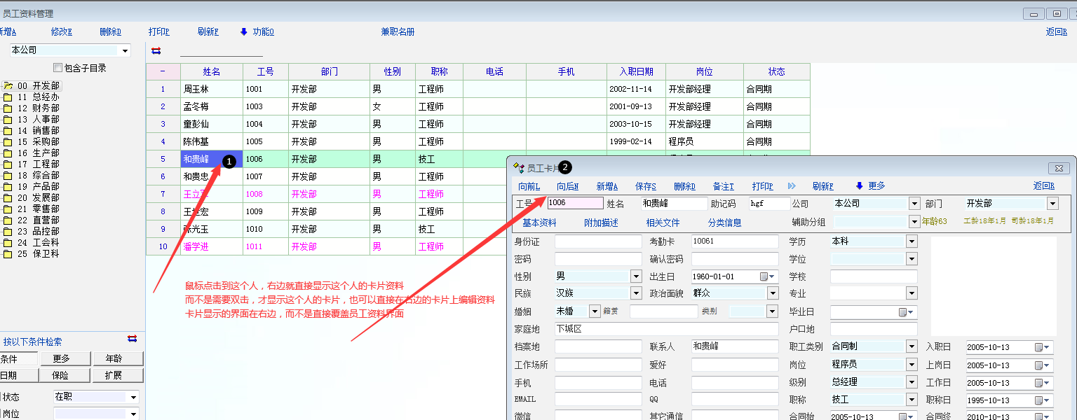 1,员工资料界面卡片显示问题-----点击哪个员工,右边直接显示卡片资料,而不是双击这个员工,再整个显示员工卡片资料(目前卡片显示,就看不到员工资料显示界面了)-----这样可以提高工作效率!!!!!