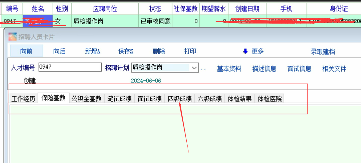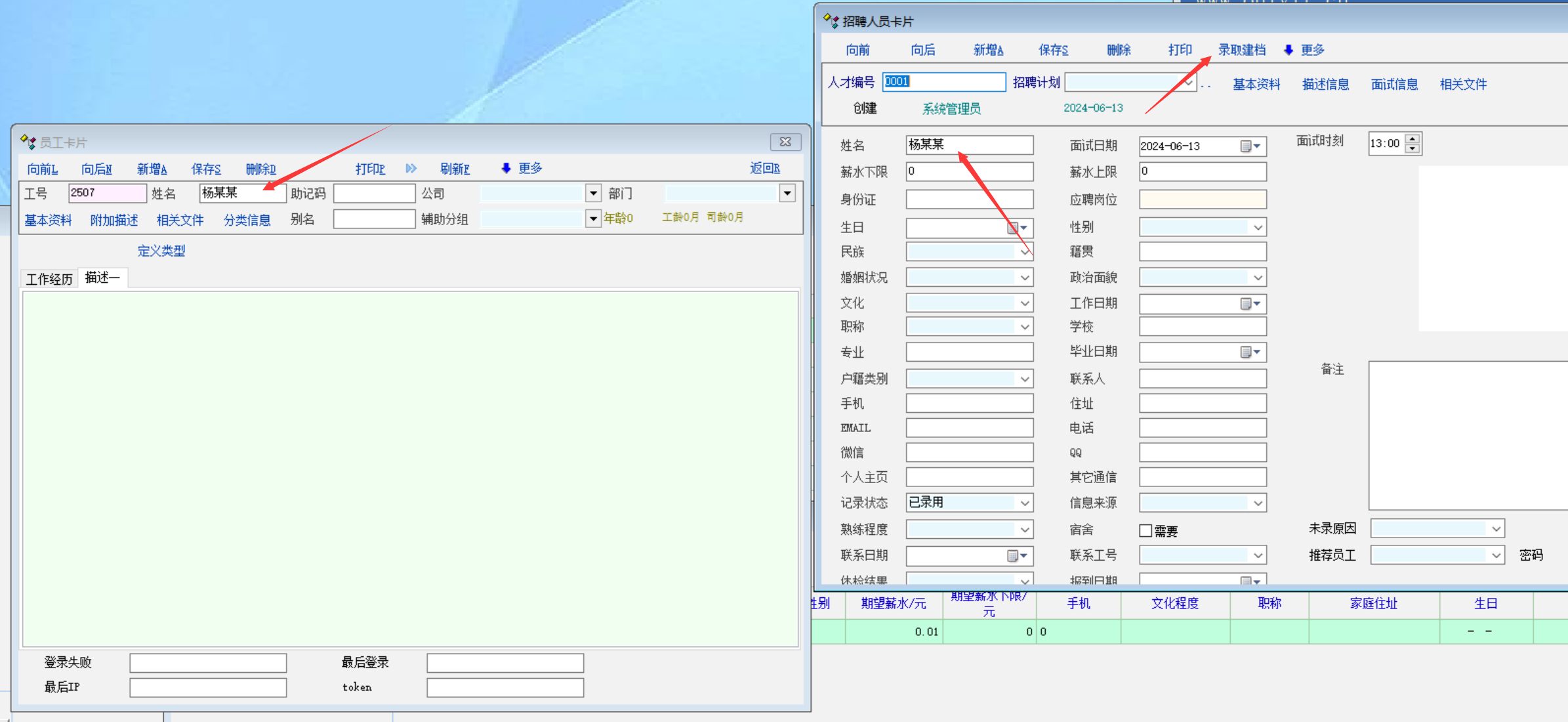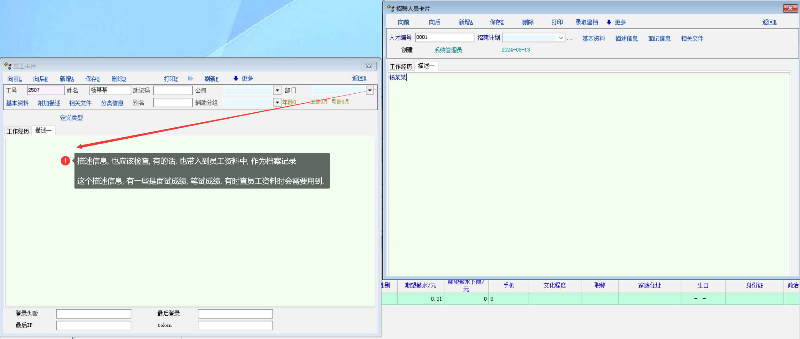 场景: 员工资料中的描述信息,定义了 面试考试成绩, 面试笔试成绩. 在应聘者资料中已经有了内容. 录取建档时, 目前系统是没有带入到新员工资料中, 建议带入到新员工资料中, 作为一种记录. 见图2: |