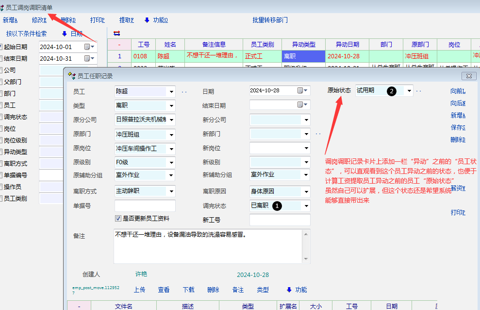 系统里面有这个,但是测试结果有问题,结果还是已离职(员工10月28日离职,离职之前都是试用期)所以发帖提了这个。实际上调岗调职里面能够体现离职之前的状态,也是为了让操作的人操作异动时,能够一目了然看到异动之前的状态,也是为了统计需要