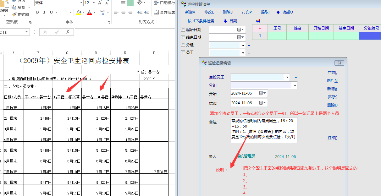 2、巡检班次表上----也就是排班表上最好可以填写一些巡检要求----备注不行(看下面图片4)