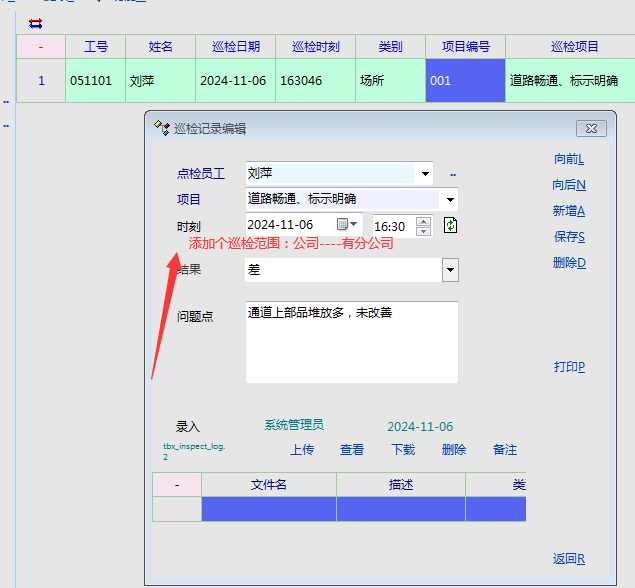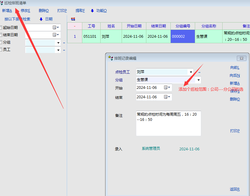 1、巡检一般至少两个人为一组:  一个人点检   一个人记录(不是系统录入人员)----再添加个巡检范围-----公司---分公司选择,所以不管巡检班次里面,还是巡检记录里面,都需要添加个协助巡检人员选项