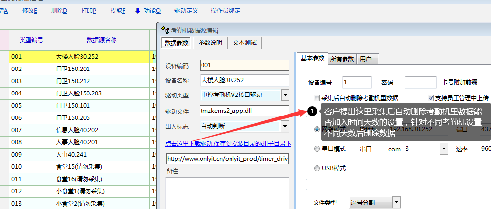 所以建议“采集后删除考勤机内数据”这里可以有天数的设置:采集后(15)天删除考勤机内数据   或者  采集后删除考勤机内数据15天删除一次(天数自由填写)------就是能够定义比如过15天采集数据后删除考勤机内数据一次,后续采集,再过15天采集后删除考勤机内数据----相当于定时任务一样