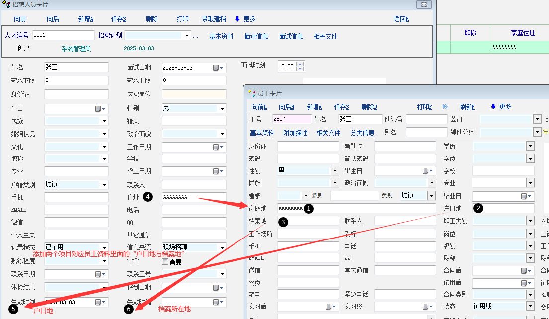 原创_应聘人员资料里面---添加“户口地”“档案地”来对应员工资料里面的户口地与档案地_人力资产