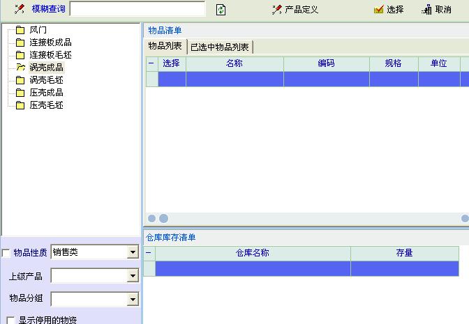 在库存管理中选组装单后,无法在物资一栏选择我想选的产品,里面没有显示我已经输入软件的产品