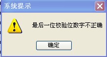 4、由于身份证数字较多,人工输入容易出错。公民身份号码(18位)是特征组合码,由十七位数字本体码和一位校验码组成。排列顺序从左至右依次为:六位数字地址码,八位数字出生日期码,三位数字顺序码和一位数字校验码。校验码由十七位数字本体码加权求和公式算出(网上可搜索计算方法),软件中完全可以判断出身份证输入是否正确,只要加入验证即可,不少人事软件在身份证上也是这样判断的,输错即出现如下对话框。(描述一)