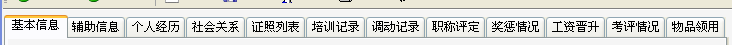 7、“员工资料管理”上建议集成度高些,在员工资料管理上员工方方面面的情况就能一目了然,如在员工资料管理上除有员工基本信息外,还知道该员工拥有什么证件、领了什么物品、内部调动情况、奖惩情况、职称评定情况、培训情况、社会关系、工资变化情况等等,同时所有内容都有支持模块,其支持模块对所有员工有分析报告统计,如物品领用模块就能查出所有员工的领用情况的分析统计,证件管理模块能看出所有员工拥有的证件情况,如拥有驾驶证的员工有几人、什么时候领取的等。当然这两者是关联的,能自动更新以保持统一。员工资料管理建议设置如下:(描述二)
