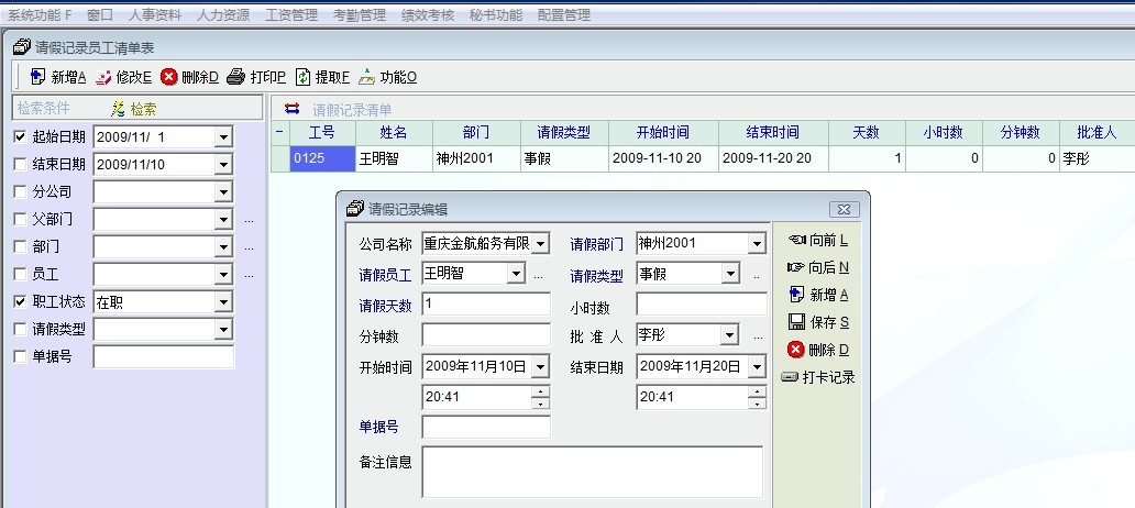 考勤管理模板中的请假记录中,请假天数有不妥之处:请假起止时间与时刻一旦确定后,那么,请假的时长自然应由系统自动计算出,完全没必要让人工来计算。再说,我现在试手工做了一个请假记录,明明是从2009/11/10--2009/11/20的20:41,可请假天数确为1天,岂不茅盾?!希望改进为:一旦确定了请假的起止时刻,则请假天数、小时数、分钟数不能由手工填写,由系统自动生成。如图1