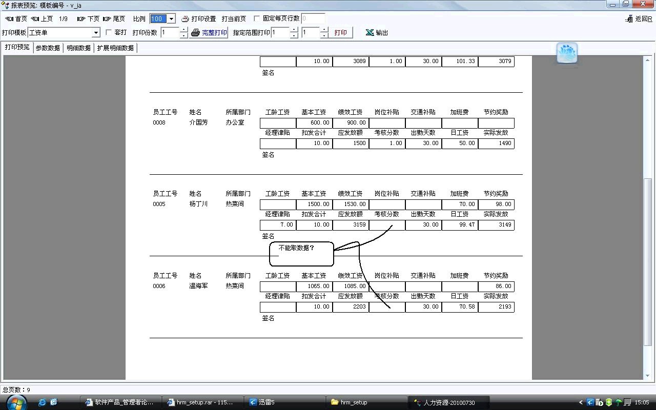 一直在用人力资源管理软件,先发现最新版还是有问题?工资报表里面有数据,根据模板生成工资条后有的项目不能从数据取数,另外就是每一列的标题能修改吗?详见附件