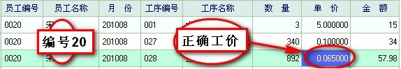 问题是工价是在工序定额中拟定好的,按照你的计算方式做同一道工序显示出来的工价就不一样了,虽然工资相差不多,但打印报表看起来却不爽了。编程时应该是工价乘以数量,而不是以工资除出数量,没有工价哪来工资,所以说还是工价显示有问题。(上面的图片是同一道工序,定价为0.065,只是不同编号的员工操作,显示出来的工价却不相同)