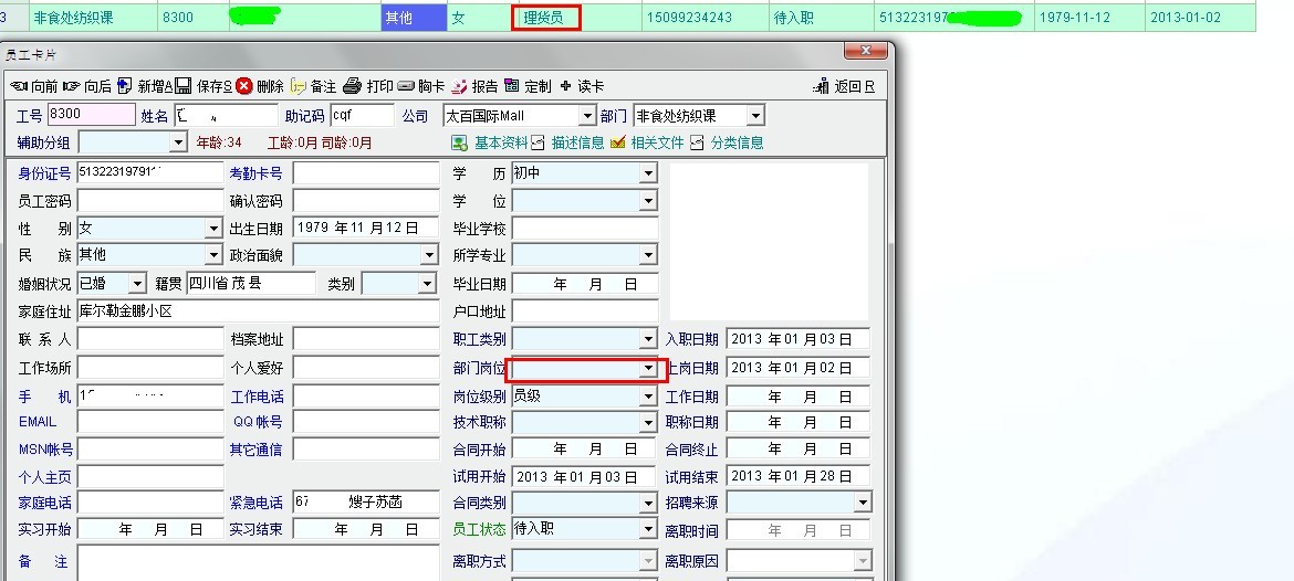 不同步显示,如图,员工资料界面可以看到该人员岗位为理货员,但是进入员工卡片界面,看到的岗位为空?录入的时候也成功并且录入了啊~理货员的id是026,我在岗位里输入026敲回车能上去理货员,打印的表格里也显示的,可是在员工卡片界面里岗位是空的。