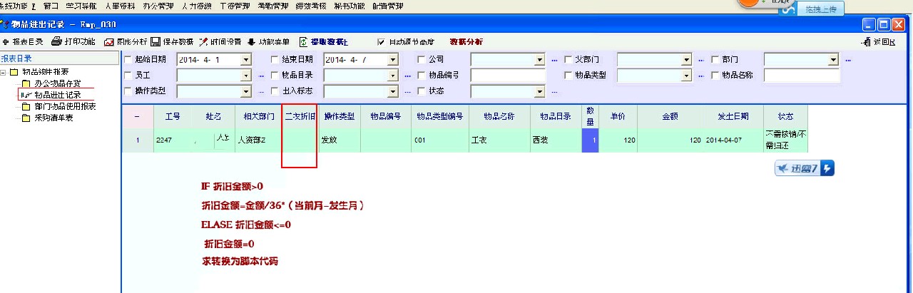 在物品管理里录入 工衣 但我们工衣是服务满3年就不用掏钱  不满3年按折旧算,自己买单!明白了吗