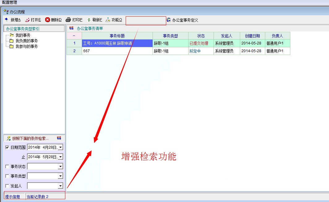 6,检索条件增加 -事务标题,扩展属性支持。特别是扩展属性比如 请假 ,扩展一个员工属性,当要查找到所有这个员工事务时就很难办了。