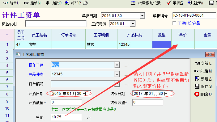 如图片1,工序科目价格定义时如果没有开始日期与结束日期,在计件工资单中输入工序与产品各类后,系统会自动输入绑定的单价。但如果在工序科目价格定义时添加了开始日期与结束日期(如图片2)后,退出系统,再次登陆(系统刷新相关资料)后,系统就不会自动输入绑定单价了。