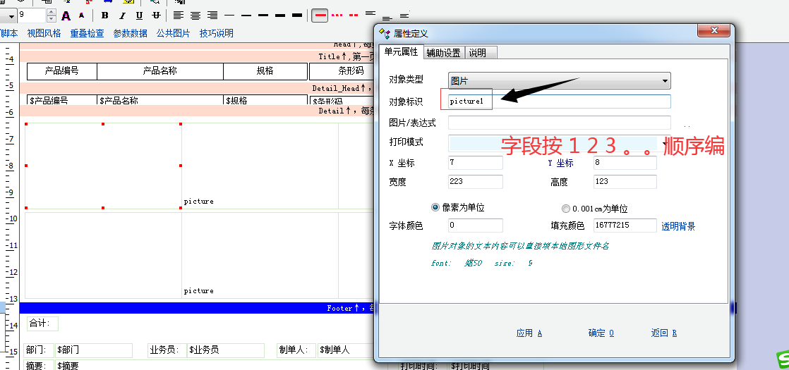 把脚本放到打印里,小计区域 图片字段可以自己增加但是只能固定数量。一般打印里要 设置每页行数和字段一样。要不然可能明细多,打印出来少了。图片字段的最支持8个,默认的。但是也可以自己修改脚本。