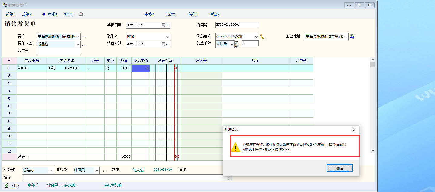 我们的流程是:销售发货单引用销售订单做成品出库,加工单引用生产计划单做产品入库,现在出现一笔,12月31日在没有做加工单的情况下(加工单在2021年1月2日做的),做了销售出库单,导致12月出现负库存(在操作前所有的仓库已设置不允许负数出库),以下是单据,希望老师改进下哦: