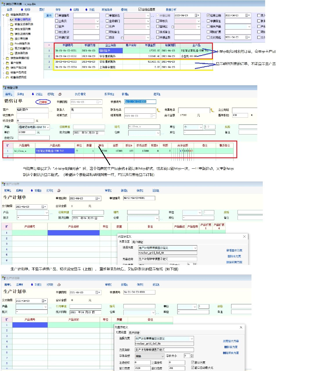 为了能够看到主产品,需要在订单中把主产品栏显示出来,如果同时显示主产品和明细产品,一旦明细产品为空,单据不能保存;但是如果只显示主产品,可能由于没有明细产品,就不能对主产品表格的显示内容进行定制,一旦重新登录,就回到系统的默认显示格式。