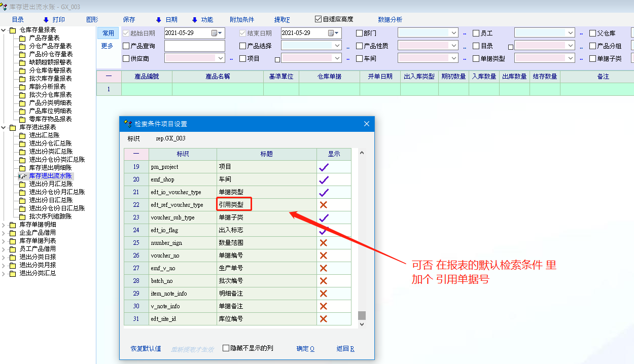 此时在 库存进出流水报表里,它的检索条件里 没有 上级单据号 可供检索使用
