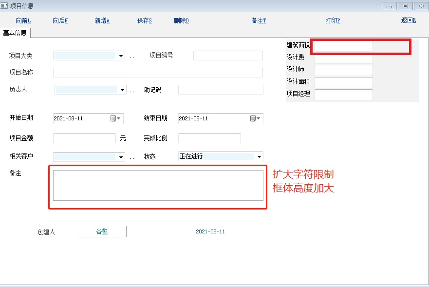 1.项目信息中备注栏字符限制能不能扩大一些,因为一个项目需要备注的东西很多,框体高度也希望扩大些,或者我们自己可以设置大小;