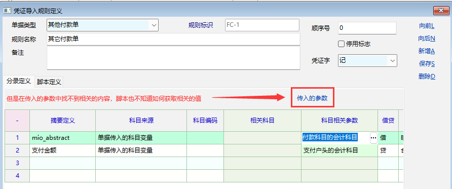 目前的收支单据,以“其他付款单”为例,引入凭证时是以收支科目对应的会计科目来生成的,这样就需要在收支科目里增加非常多的项目,比如“招待费”项目,有时需要计入“管理费用”,有时需要计入“销售费用”,是根据费用的实际用途来确定的,这样就需要新增两个“招待费”收支科目,分别对应不同的会计科目。目前的想法是在单据的“参数配置--单据明细附加扩展属性定义”里自定义一个“会计科目”明细,直接输入相关的会计科目代码,这样就可以避免上述情况,尽可能减少收支科目的设置数量。但是在凭证模板中如何获取新增的明细值,一直没有找到合适的办法,在单据传入的参数中找不到,脚本又不知道如何获取,希望老师和朋友们帮忙。大家如果有更方便快捷的办法也欢迎指导!