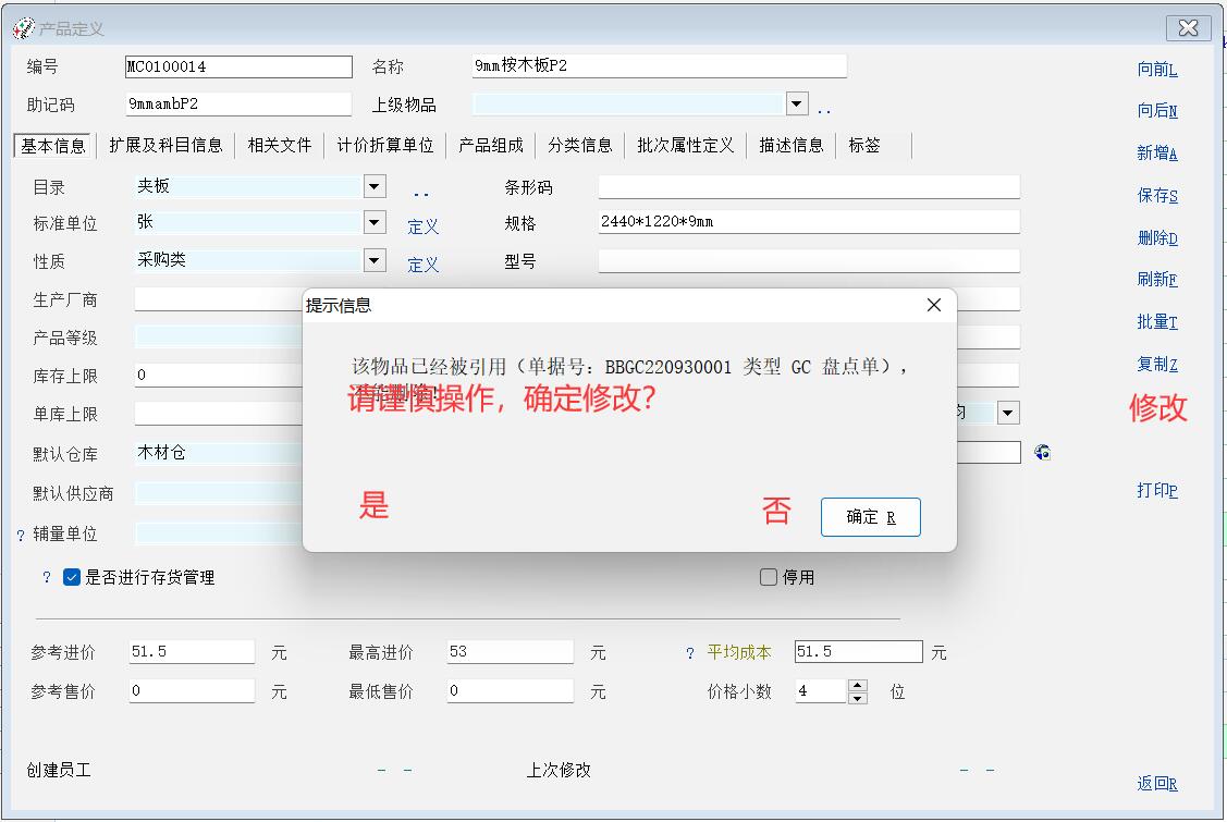 目前产品资料修改内容后保存就修改好了,非常方便,但太容易修改了;如我们资料员不熟悉系统逻辑,直接把名称A改成B,造成此料号有关的单据、报表和库存都不对,也容易误操作;能否如删除时一样先弹出一个提示确认后才能操作?编辑界面增加一个菜单,“修改”,点修改后才可以修改,被引用过的产品修改时弹出提示“被引用,是否确认修改?” 确认后才能修改。
