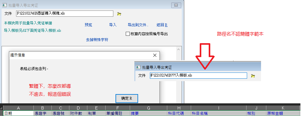 2、將 凭证导入模板 改爲繁體字後,點預覽或導入,也導不進去,提示列 -